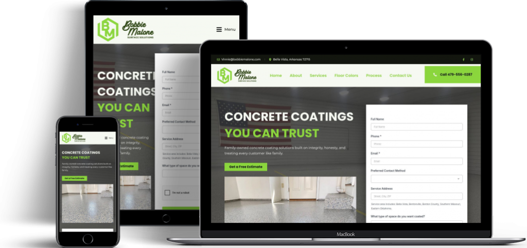 We built a user-friendly website for Bobbie Malone Surface Solutions that clearly showcases their family-owned concrete coating services in Northwest Arkansas. The design highlights key services along with easy navigation and strong calls to action for free estimates. With clean visuals and optimized content, the site makes it simple for visitors to explore offerings and connect with the team.